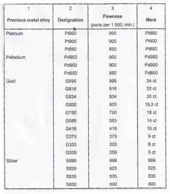 The designation of the precious metal content was summarised by the SABS in Table 1 (NOTE 12).